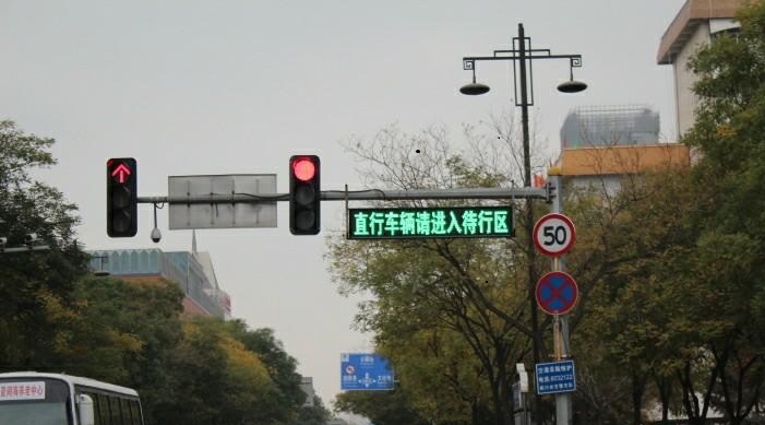 為了提高路口通行能力。在路口設置的直行設施,當行駛至這類路口的車輛遇直行和左轉彎信號放行時,路口一側紅綠燈路燈桿上的引導電子屏會適時顯示“請直行車輛進入待行區等候放行”的提示,此時,直行車輛可以進入路口施劃的待行區等待綠燈放行后即可通行。