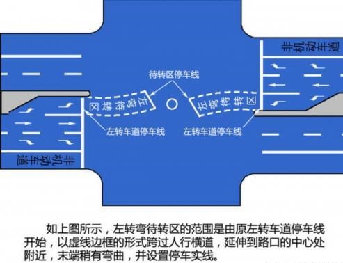 “左轉彎待轉區”的意思,就是“等待左轉彎的區域”。左轉彎待轉區專門設置在路面較為寬闊,而且又設有多相位交通信號燈的路口,簡單說就是繁忙的十字路口。